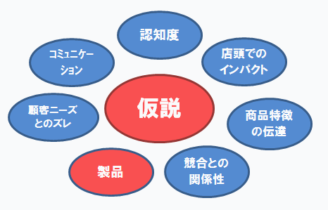 「認知度」「店頭でのインパクト」「商品特徴の伝達」「競合との関係性」「製品」「コミュニケーション」「顧客ニーズとのズレの有無」、など至る所に問題点は潜んでいるのに、最初から「製品」にあたる味覚だけに仮説を狭めてしまっています。