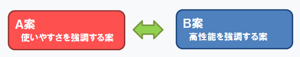 例えば、「使いやすく、高性能」といった商品だった場合、「使いやすさを強調する案(A案)」か、「高性能を強調する案(B案)」のどちらでいくか、という方向性を明確にする『複数の解決案』を作成します。
