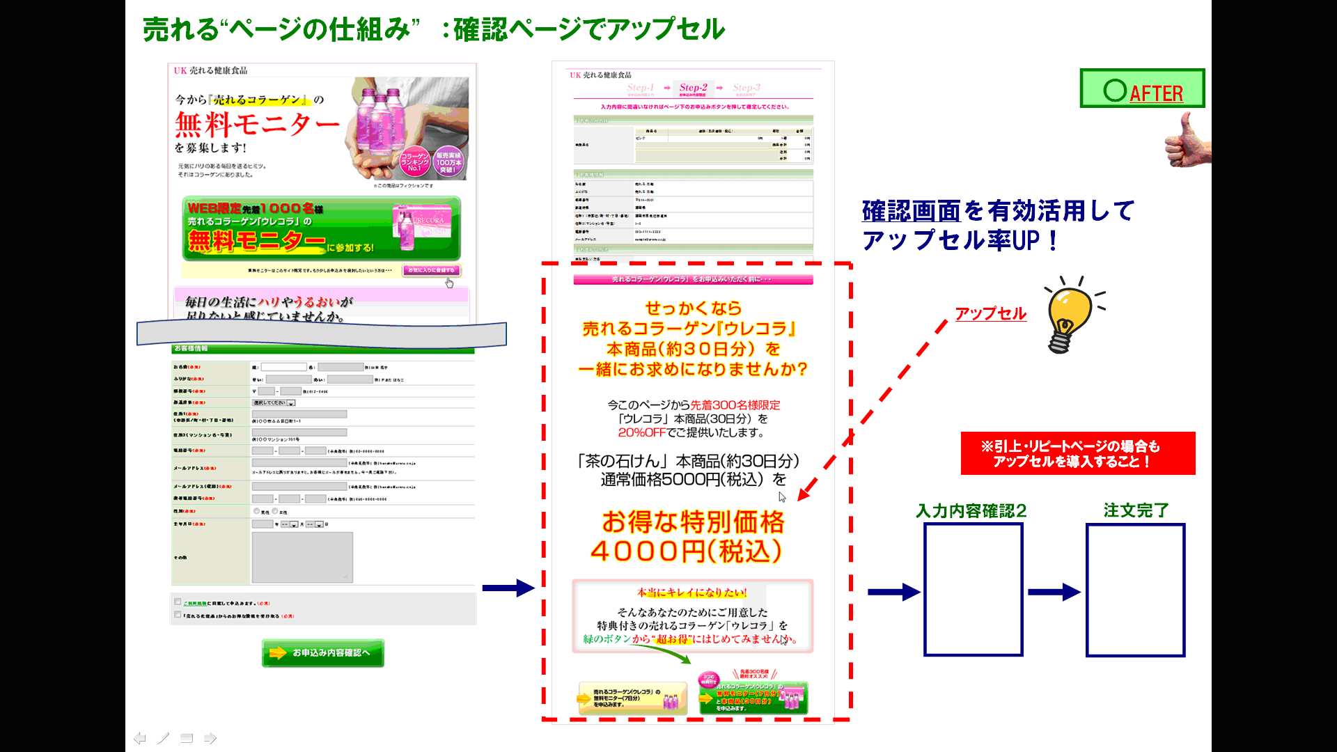 ネットで劇的にアップセル率を上げるために、一番効果的なタイミングはお客様が面倒くさい申込みフォームを記入した後、つまりは「申込確認ページ」 である!例えば「無料お試しセット」を申込もうとしているお客様に対しては、『せっかくなら本商品を買いませんか?』とその場で本商品に引き上げたり、本商品を「その都度」で申込もうとしているお客様には、『定期コースにしませんか?』とその場で定期コースに引き上げたり、「商品A」を申込もうとしている お客様には、『商品Bも一緒にいかがですか?』とこの確認ページででクロスセル誘導をするのである!具体的にいうと、“確認ページ”で「お申込みを確定する前に…」とお客様を足を止めて、“確認ページ”でアップセルしたい方向にお客様を説得してゆき、ページの最後で2つのアイコンを左右で表示するのだ!例 えば“左側”には「7日分無料お試しセットのみで申込む(広告LPで申し込もうとした商品)」のアイコンを、“右側”には「30日分の本商品を申込む (アップセルさせたい商品)」のアイコンを配置するのだ。これは劇的にアップセル率が上がる最高のテクニックだ!