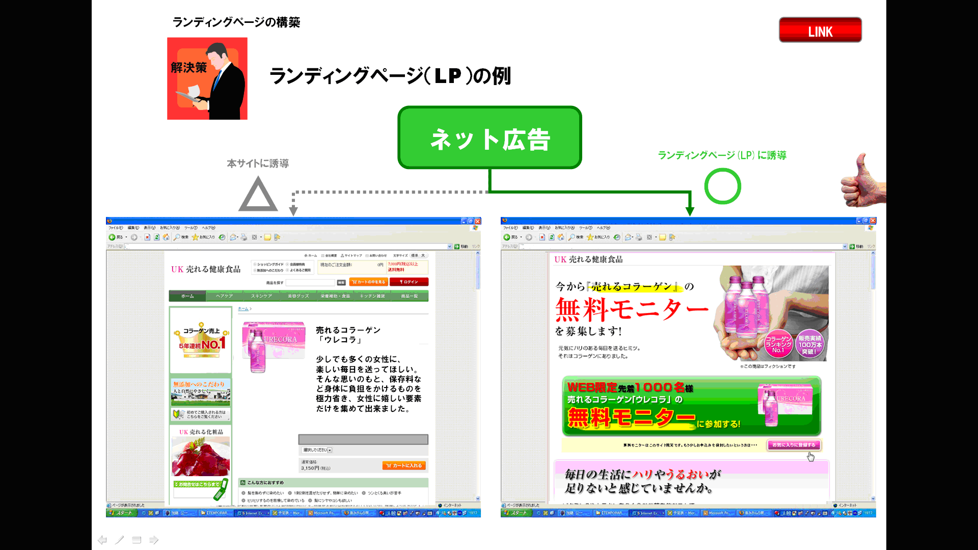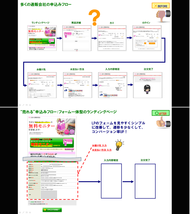 多くのネット広告専用のランディングページは申込アイコンを押すとショッピングカートになるが、これが最悪だ。日本のショッピングカートは平均的に 完了ページまで8つの遷移がある。ランディングページからショッピングカートにつなぐ構造をやめ、必ずランディングページと「申込みフォーム」を“一体型”にすること!ランディングページの中に申込みフォームを設置して、お客様これを記入したら“入力内容確認ページ”があって、その次に“注文完了ペー ジ”がある。というシンプルな構造にすることで、お客さまはたった“3つ”のページ遷移で商品を購入できるようになり、劇的にコンバージョン率が上がるのである!