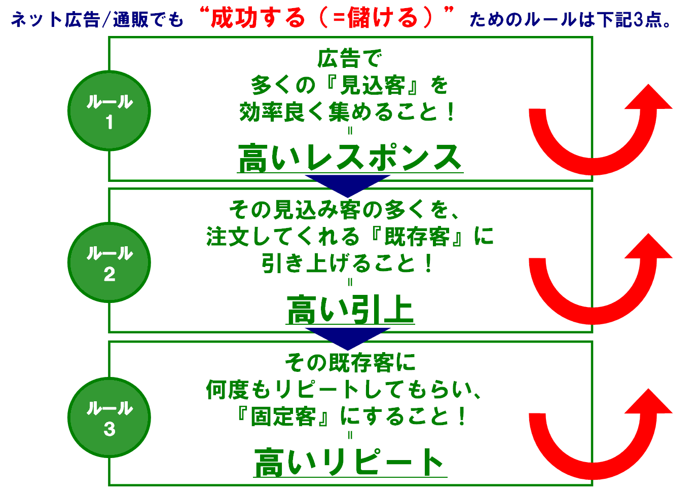 ネットで効率を劇的に上げ、売上を劇的に最大化するためには「①レスポンス:まずは広告で“見込客”を徹底的に集め ⇒ ②引上:その見込客の多くを購入に引上げて“既存客”にして ⇒ ③リピート:その既存客に何度も何度リピート購入してもらい“固定客”に育てる」という3つのルールに沿ったプロセスを継続的に行うことである。成功している通販企業は、例えどんな業種であろうと、上記3つのルールに沿ってネットマーケティングを行っている。