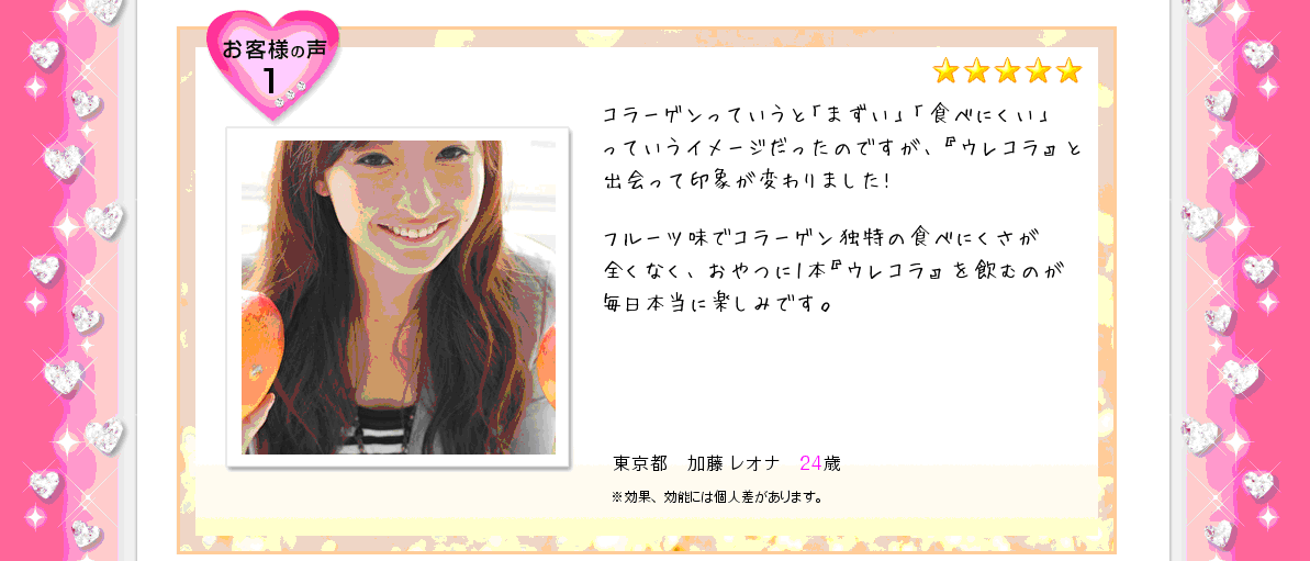 ランディングページに「お客様の声」は必ず入れるべきである。お客様の声があると、購入を検討している人は自分以外の人が既に使っていることに対して安心をする。特に日本人は「みんなが使っているもの」が好きなので、多くのユーザーに支持されている商品を好む。つまりは広告主側(販売側)が「あーだ、こーだ」と百回言うよりも、購入したお客さんの一言の方が効果があったりもするのだ。ただし、お客様の声は通販の世界ではサクラが多いのも事実。単純 なイニシャルのデジタル文字のお客様の声だと、いかにもニセモノと消費者はとらえる。お客様は声には必ずお客様“写真・本名・年齢・地域”を入れるべきで ある(あと、可能であれば手書き)。ここまで入れて、初めて消費者に信用されるわけである。