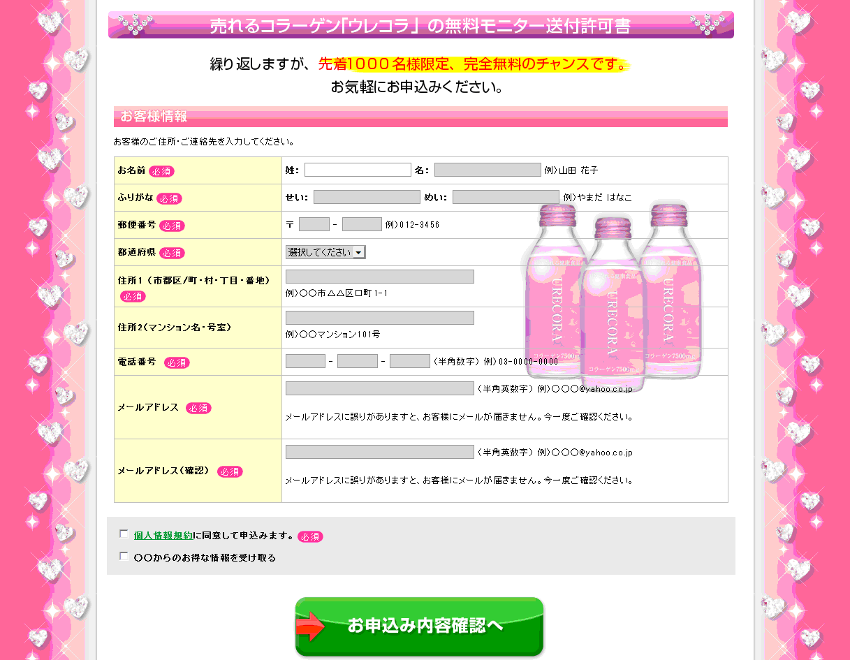 多くのネット広告専用のランディングページは申込アイコンを押すとショッピングカートになるが、これが最悪だ。日本のショッピングカートは平均的に 完了ページまで8つの遷移がある。ランディングページからショッピングカートにつなぐ構造をやめ、必ずランディングページと「申込みフォーム」を“一体型”にすること!ランディングページの中に申込みフォームを設置して、お客様これを記入したら“入力内容確認ページ”があって、その次に“注文完了ペー ジ”がある。というシンプルな構造にすることで、お客さまはたった“3つ”のページ遷移で商品を購入できるようになり、劇的にコンバージョン率が上がるのである!