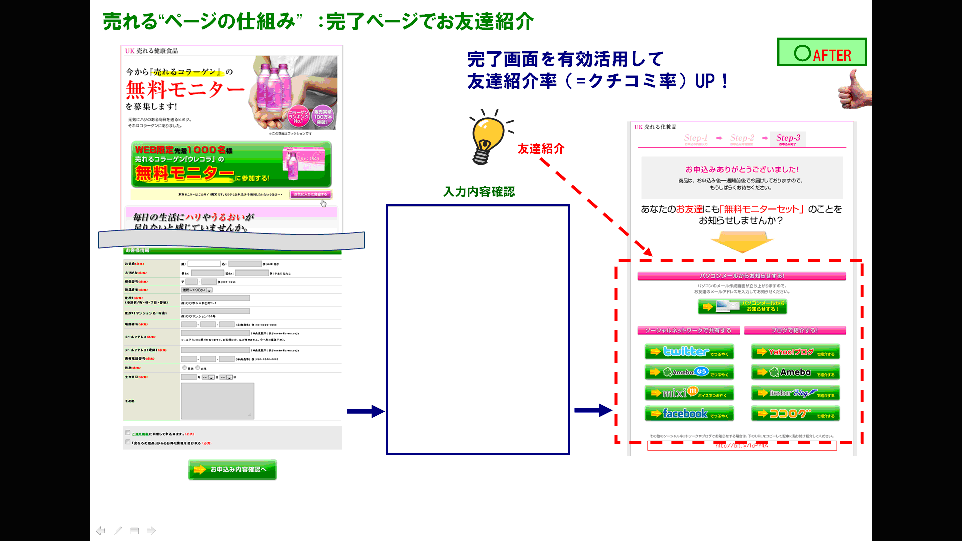 “クチコミ”を狙いたい場合もランディングページの中ではなく、、一番効果的なタイミングは、お客様が申し込みを完了した後、つまりは『完了画面 (ページ)』である!そして、『完了画面』では単純に「ありがとうございました」とお礼をいうだけで終わるのではなく、ここの『完了画面』で友達紹介を狙 うのである! そこにスクリプトを埋め込んだ紹介アイコンを設置することで、各アイコンを押すと、“簡単に” “2クリックで”メールやソーシャルメディア上に指定した文章とURLをクチコミすることができ、劇的に“クチコミ率”がアップする。当然ながら紹介された側の友達が申し込みをすれば、そのランディングページの『完了画面』にもまた友達紹介の提案が入るので、その友達がまた紹介をすれば、どんどん“友達紹介(クチコミ)”の連鎖が起きていくのだ!