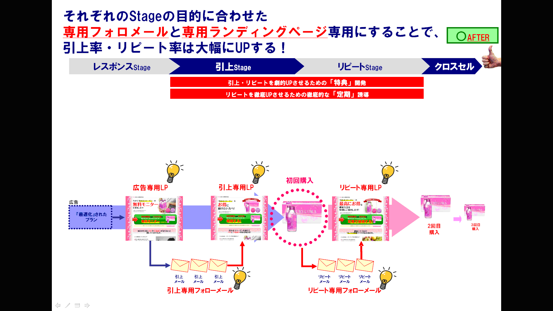 CRMにおける引上率・リピート率を上げるためには、引上・リピートそれぞれのステージの目的に特化した『専用フォロメール』と『専用ランディング ページ』を必ず制作することである。仮に『広告専用ランディングページ』で“商品A”のお試しセットなどで見込客を獲得したら、そのお客様にはその後“商品A”の本商品購入を勧誘する『引上専用フォローメール』を送り、そこから“商品A”の本商品しか買えない『引上専用ランディングページ』にリンク(誘導)すること!そして本商品を買ってくれたお客様には“商品A”のリピートを勧誘する『リピート専用フォローメール』を送り、そこから“商品A”の本商品を定期コースでしか買えない『リピート専用ランディングページ』にリンク(誘導)すること!