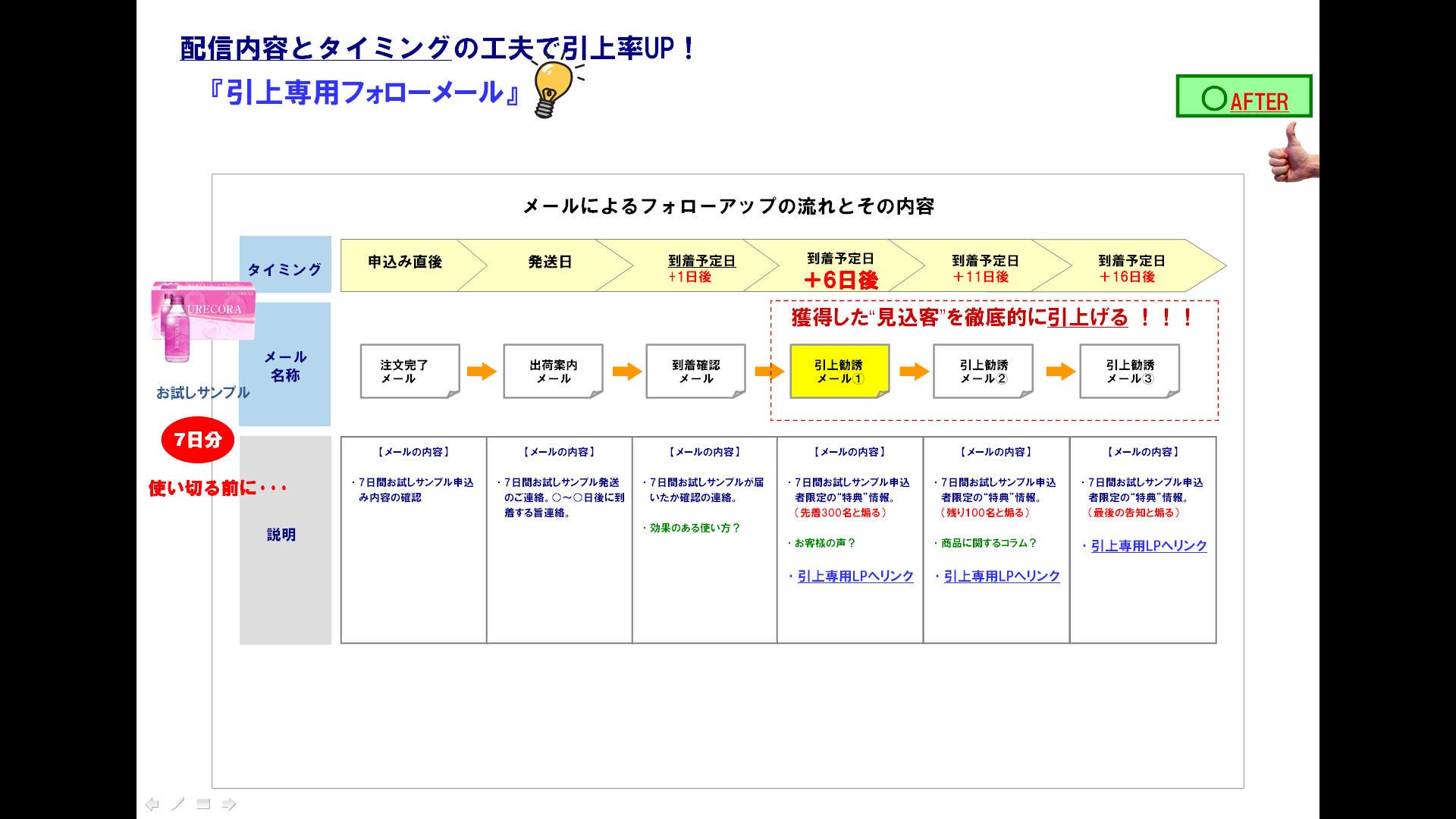 フォローメールの配信タイミングは、お客様の商品の“消費サイクル”に合わせると、引上・リピート率が上がる。例えば、“7日分”のお試しサンプル を申込みしたお客様には、商品を使い切る商品到着“6日後”くらいに「本商品はいかがですか?」という引上専用フォローメールを送るのである!そして例え ば、“30日分”の本商品を申込みしたお客様には、商品が残り少なくなった商品到着“25日後”くらいに「定期で継続しませんか?」というリピート専用 フォローメールを送るのである!そうすることで、お客様は商品を継続するタイミングにあることをフォローメールで気づき、引上率、リピート率は劇的に上がるのだ。