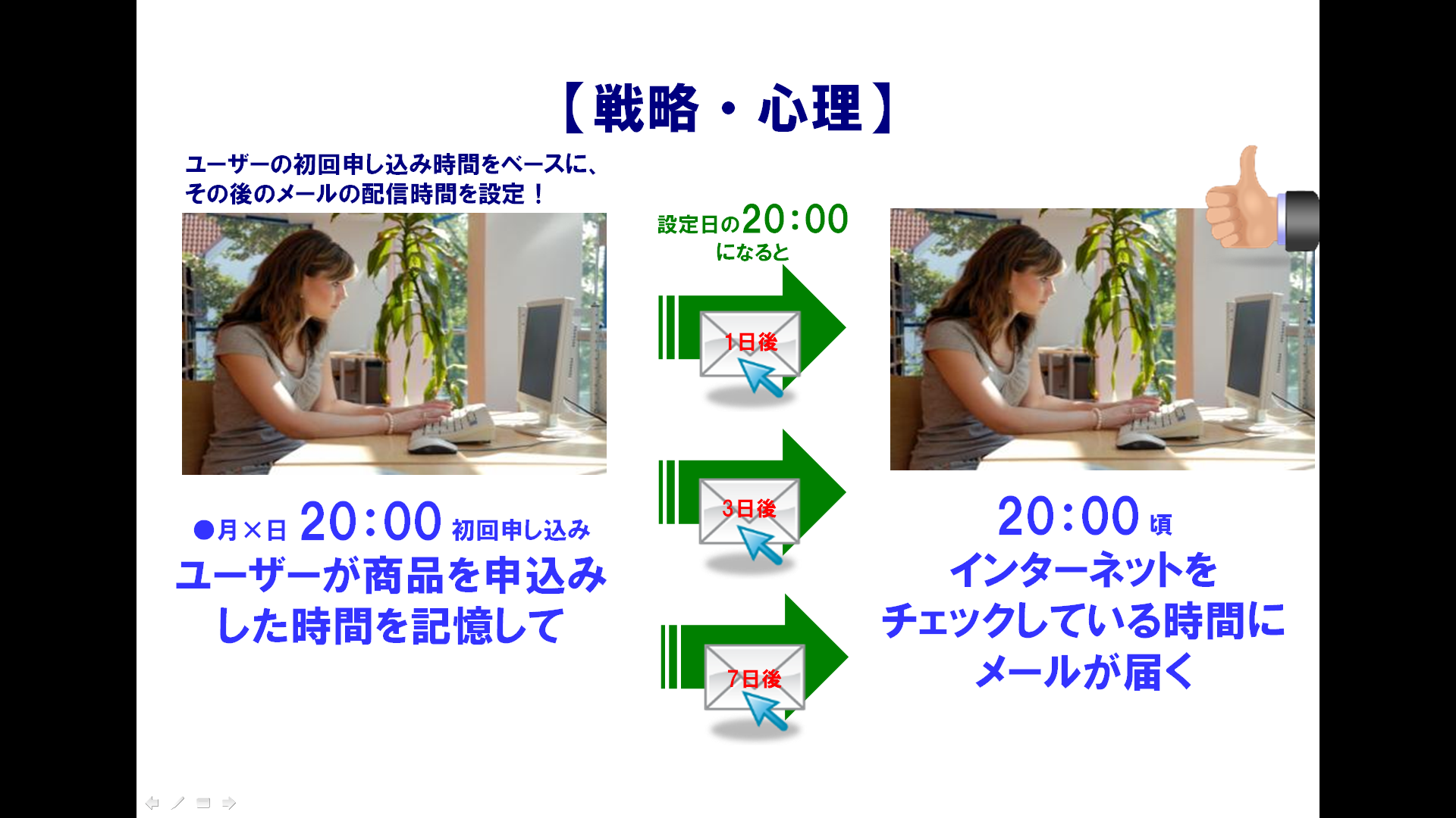 さらにフォロメールの効果を上げるには、配信タイミングをお客様の“初回申込み時間”に合わせて送ることである。例えば、夜の“20:00”ぐらい に初回お申込みをしたお客様には、それ以降のフォロメールを夜の“20:00台”に送るのである!例えば、朝の“10:00”ぐらいに初回お申込みをした お客様には、それ以降のフォロメールを朝の“10:00台”に送るのである!その時間がその特定のお客様がネットにアクセスしている時間帯である可能性が高いし、消費意欲がある時間帯である可能性が高いのだ。そのタイミングでお客様にタイムリーにフォロメールが来れば、引上率、リピート率は劇的に上がるのだ。