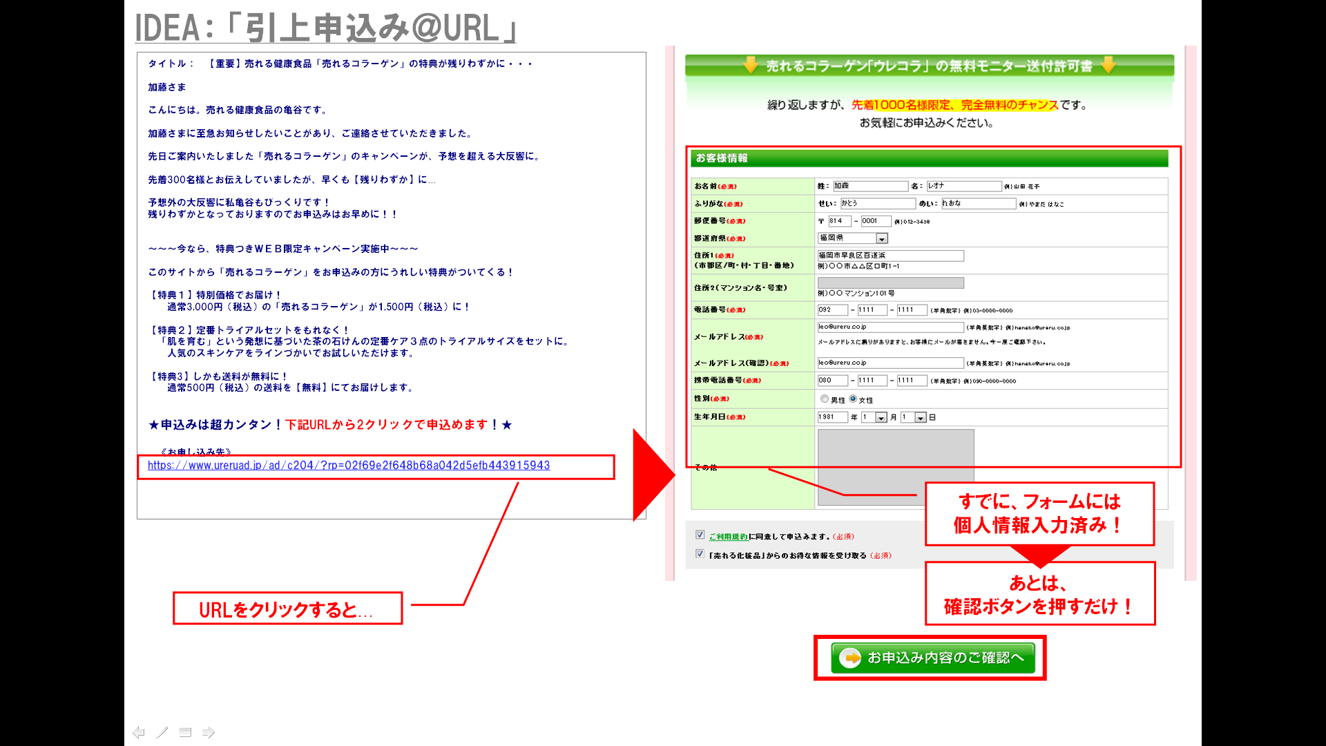 現在、引上率・リピート率を最高に上げる最強の方法は、フォローメールから『2クリック』で申込みができるようにすることである!フォローメール上 でお客様ごとに個別のURLを準備して、お客様がURLをクリックすると、自動的に引上専用ランディングページやリピート専用ランディングページのフォーム上には、初回申込みした際のお客様情報が全て記入済みの状態で表示されるようにすることである!!つまりは、お客様は申込みボタンを押すだけで、申込み 完了となるのである!!!フォローメールから実質“2クリック”で申込み完了となるのである!!!!この方法がお客様にとっても、一番楽な方法であり、 ID/PASS方式に比べコンバージョン率は1.5倍~2倍ぐらい上がり、引上率・リピート率が劇的に上がるのだ!!!!!