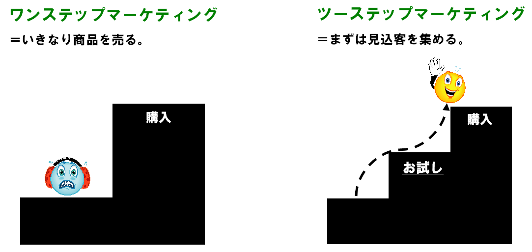 ≪①レスポンス≫ネット広告を行う場合、商品を売ってはいけない!ネット広告を行う場合、商品に興味がある人を募集するべきである!具体的には“無料サンプル”や“低価格のお試しセット”や“資料請求”などを通じて、商品を購入する可能性が高い『見込客』のリストを手に入れることだけに広告は集中する のである。ズバリ、ネットにおいては“ワンテップマーケティング(1Step)”よりも、“ツーステップマーケティング(2Step)”の方が最終的な CPO(Cost Per Order)は良いのだ!