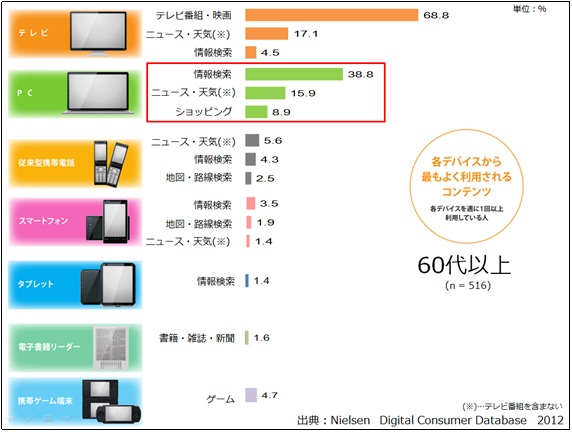 一方、60代以上のデバイスとコンテンツの組み合わせは、PCから「情報検索」が39%、「ニュース・天気」が16%、「ショッピング」の利用が9%と、その他のデバイスからのコンテンツ利用割合に比べPCの利用割合は未だに高く、テレビと合わせると、従来型のスクリーンの利用が主流となっているようです。