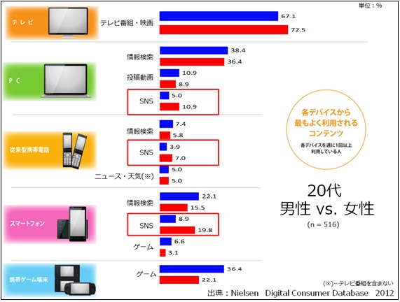 コンテンツに注目すると、20代女性の「SNS」の利用が特徴的でスマートフォンから20%、PCから11%、従来型携帯電話から7%といずれも男性の倍近い利用者が存在していることが分かります。一方で男性は「ゲーム」への関心が高いようです。