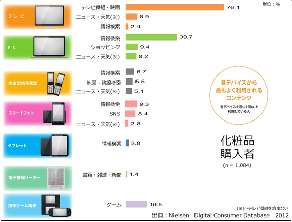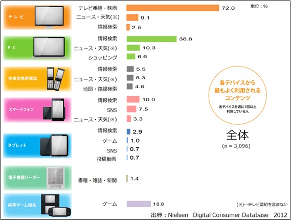 タブレット、電子書籍リーダーは普及率との関連もあり、利用されているコンテンツの割合も低くなりました。