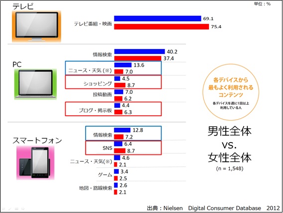 次に、全体の中でも利用割合の高かったテレビ、PC、スマートフォンに注目して、男女の比較をしてみます。テレビは、女性の利用割合が75%と男性の69%より6ポイントほど高く、女性の方がテレビから「テレビ番組・映画」に接触する機会が多いことが分かります。PCとスマートフォンの利用では、男性はPCから「ニュースや天気」を見る割合が14%、スマートフォンから「情報検索」をする割合が13%と女性よりも倍程度の利用率があります。一方、女性は9%がPCからの「ショッピング」利用とスマートフォンからの「ソーシャルネットワーキングサイト(SNS)」利用となりました。PCからの利用コンテンツでは「ブログ・掲示板」も女性の利用割合が若干高くなっています。男性は情報を求め、女性はショッピングやコミュニケーションにデバイスを活用している傾向が見えてきます。