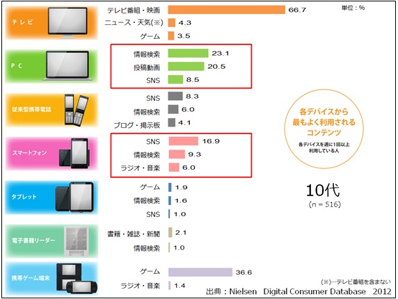 スマートフォンからのコンテンツ利用では「SNS」が17%で最も高く、図表にはありませんが「ブログ・掲示板」の利用割合も「ラジオ・音楽」の6%についで割合が高くなっています。これらを従来型携帯電話からの利用コンテンツと比較すると利用されるコンテンツの順位に大きな変化はみられず、10代はスマートフォンを保有することで利用動向が大きく変化している状況ではないようです。