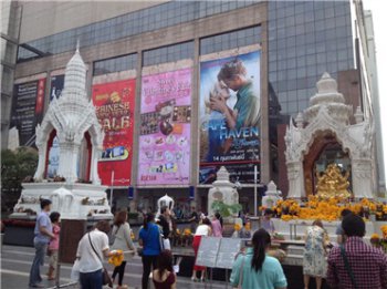 セントラルワールドの前には恋愛と商売の神様が祀られており、多くの人々が花を供えています。セントラルワールドに限らず、タイの商業施設やオフィスビルには、神様が祀られている場合が多く、お供えをするタイ人の姿を多く見かけます。とてもタイらしい光景です。