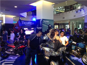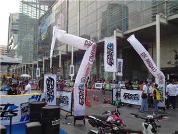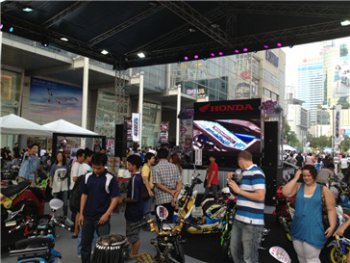 また、セントラルワールドの前には幅200m前後のスペースがあり、PRや販促目的のイベントが頻繁に行われています。下の写真は、同所で行われた市販のスクーターによるレースイベントです。参加者は一般市民で、2日間にわたり予選と決勝が行われました。同期間中に多くのバイクメーカーが百貨店の内外で実車展示イベントを行い、同百貨店はバイク一色となりました。