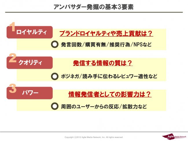 その為にもアンバサダー候補を発掘する際に一定の指標が必要となり、分析する際の大きな助けになります。