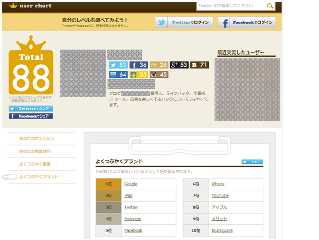 ちなみに弊社では、『ユーザーチャート』というサービスを提供しており、Twitter/Facebook/ブログなど8つのサービスを利用する個人の影響力を「レベル」で計測できるようになっています。