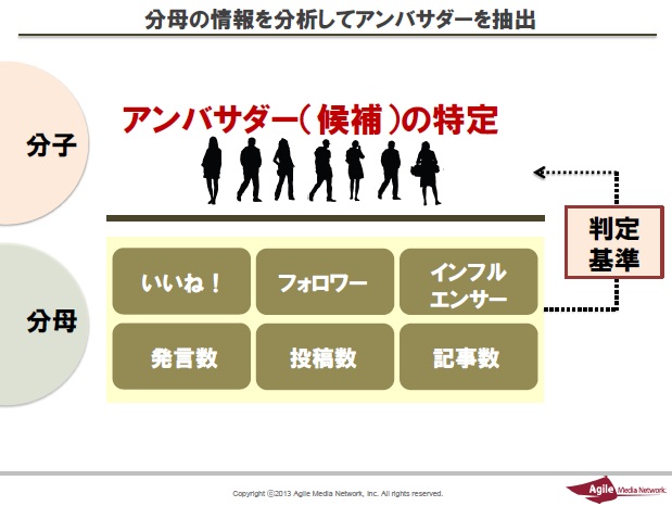 つまり、ソーシャルメディア上の様々な指標を『分母』と考えて分析をすることで、ブランドにとって貢献してくれる「熱量の高いファン=アンバサダー」を見つける事をゴールに設定します