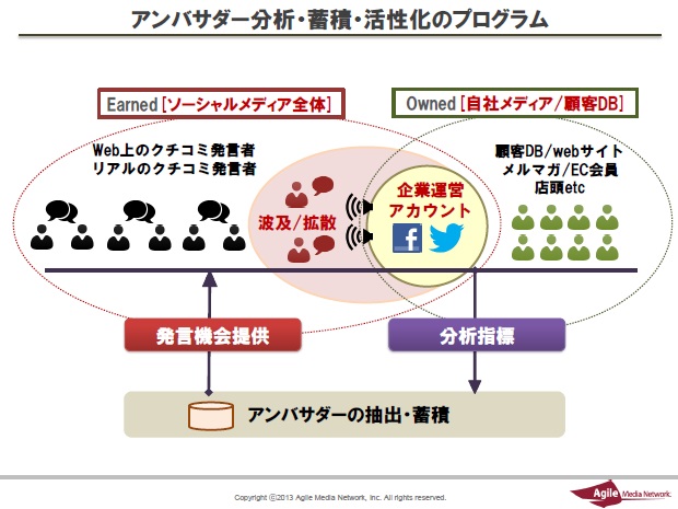 そして、“アンバサダー”はデジタルやソーシャル上に限って存在するではなく、あくまでも「人」軸でとらえ、リアルの活動やタッチポイントも含めて分析・蓄積・活性化していくのが理想です。