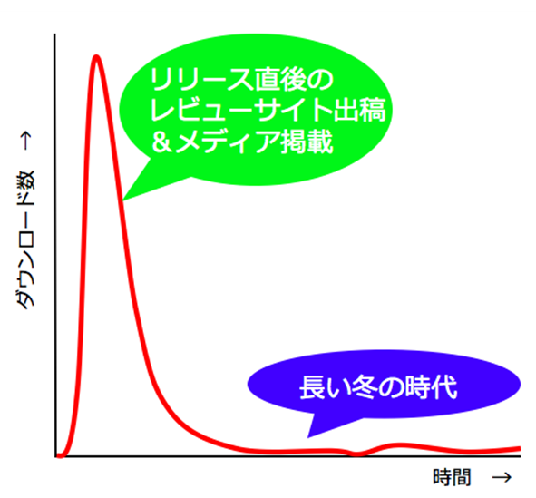 上のグラフで言うと、一気にダウンロード数の山が出来たと思ったら急降下。