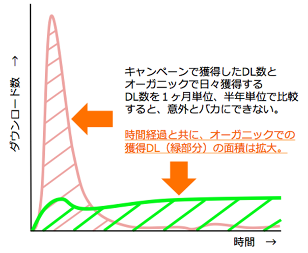 また、1日たった300ダウンロードだったとしても、時間経過と共に累計のユーザー数は増え続けますので、大型広告を一発打つよりも長期的には多くのユーザーを獲得できます。