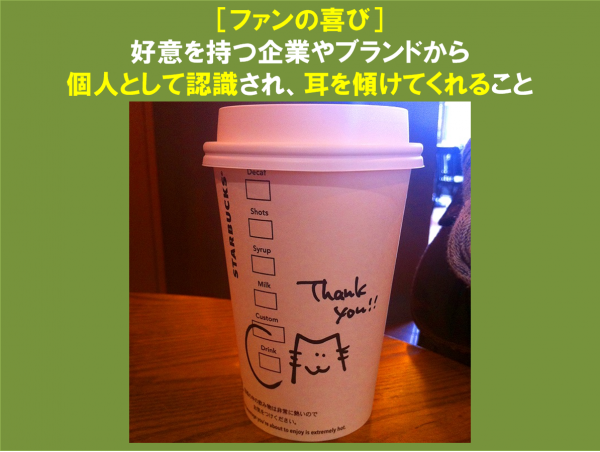ファンの喜びとは『好意を持つ企業やブランドから個人として認識され、耳を傾けてくれること』ではないかと感じています。