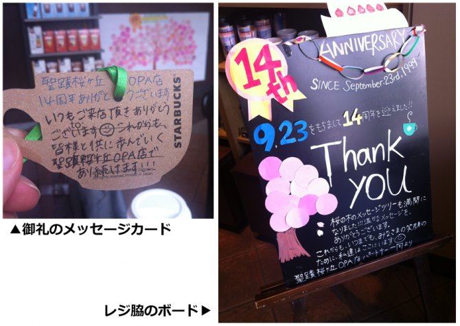 記念日から数日間、参加した来店者には手書きで御礼のメッセージカードを渡し、レジ脇に感謝を伝えるボードが用意されていました。