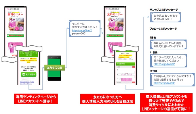 LINE IDを入力する必要はありません。クリック1つで、消費者側も早く簡単に行うことが可能なのです。例えば、消費者が無料モニターに参加しようとしている場合、まずは専用のランディングページにLINEの「友だち追加」アイコンが表示されます。クリックすると、LINEアカウントへ誘導されるので、そこで友だちになります。友だちになると、「モニターに参加する方はこちら!」などのメッセージと一緒に個人情報入力用のURLが届きます。URLをクリックするとモニター申込みページに飛ぶので、そこから通常通り情報を入力して完了です。その後、「自動フォローLINE(ステップLINE)」が届くようになります。