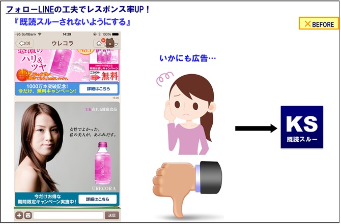 いかにも広告っぽい写真や画像などを張り付けただけのものや、いかにも宣伝くさい装飾文字を多用しているような「自動フォローLINE(ステップLINE)」は既読スルーされます。