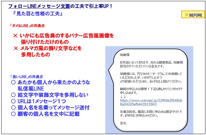 どのような「自動フォローLINE(ステップLINE)」だと引上率・リピート率が上がるかというと、個人から来たかのようなもの、絵文字や装飾文字を多用していないもの、URLが1メッセージ1つ、個人名を名乗ったもの、顧客の個人名を文中に記載したものなどです。
