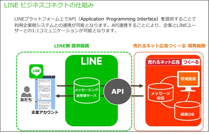仕組みとしては、LINEプラットフォーム上でAPIを提供することで利用企業側システムとの連携が可能になるため、企業とLINEユーザーとの1to1のコミュニケーションが可能となるのです。