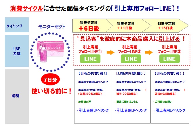 例えば、7日分のモニターを申込んだお客様には、商品を使い切るであろう商品到着の“6日後”くらいに、「本商品はいかがですか?」という「引上専用フォローLINE(ステップLINE)」を送ります。