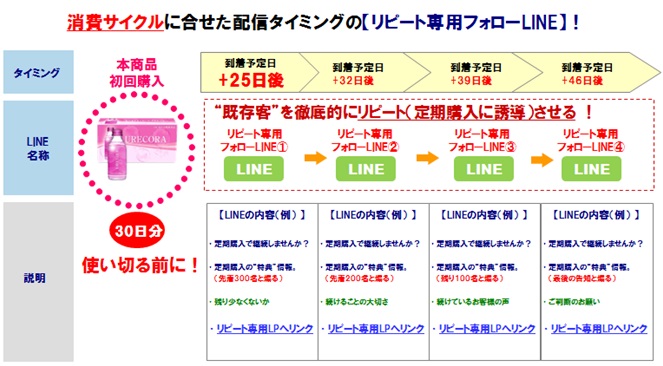 また、30日分の本商品を申込んだお客様には、商品が残り少なくなったであろう商品到着の“25日後”くらいに「定期で継続しませんか?」という「リピート専用フォローLINE(ステップLINE)」を送ります。