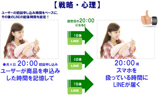 2つ目の機能は、初回申込み時間に合わせた「自動フォローLINE(ステップLINE)」、つまりは、『配信タイミングを“初回申込み時間”に合わせると引上率・リピート率が上がる!』ということです。
