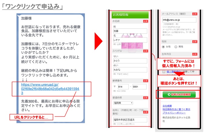 現在、引上率・リピート率を最高に上げる最強の方法は、「自動フォローLINE(ステップLINE)」から“ワンクリック”で申込みができるようにすることです。「自動フォローLINE(ステップLINE)」上でお客様ごとに個別のURLを準備して、お客様がURLをクリックすると、自動的に引上専用ランディングページやリピート専用ランディングページのフォーム上には、初回申込をしたお客様情報が全て記入済の状態で表示されるようにします。つまり、お客様は申込みボタンを押すだけで、申込み完了となるのです。