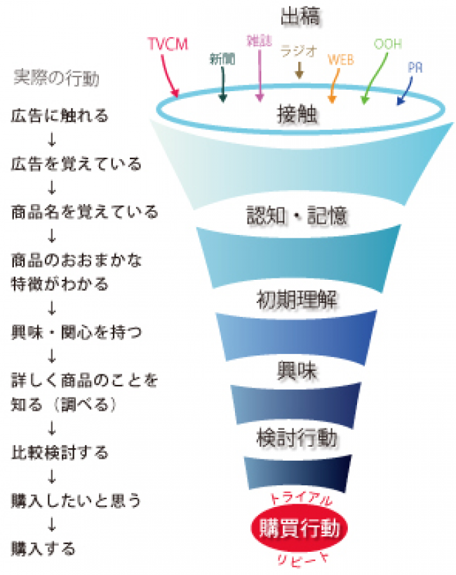 平たく言うと「知らない商品には興味を抱かない」「興味を抱かない商品は買わない」といった段階的なフローのなかで、上層から各層のボリューム(パイ)が小さくなっていき、最終的な実売へとたどり着くという考え方です。