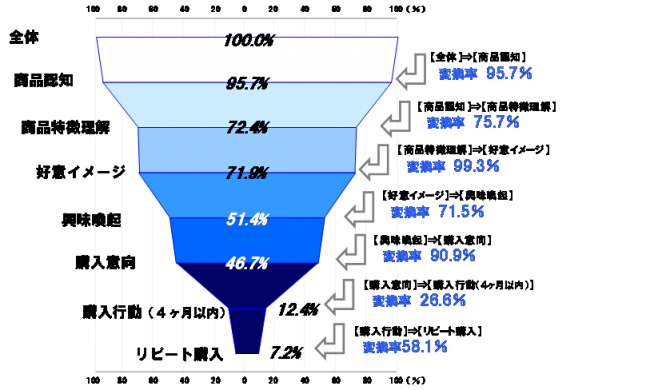 こうした質問をファネルの各中間指標である「認知」「内容理解」「好意イメージ」「興味」といった各段階において都度聞いていきます。