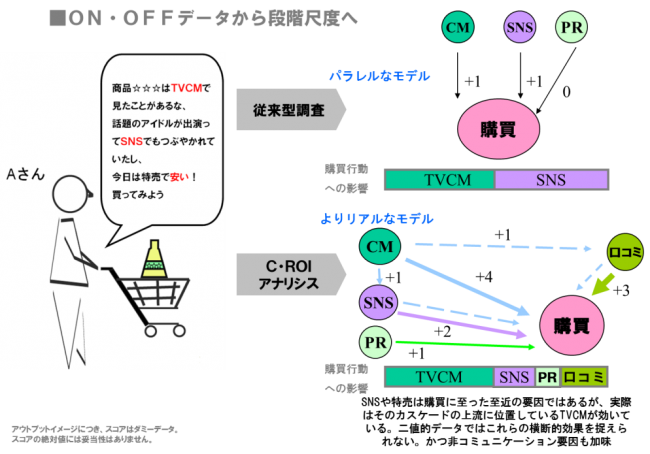 こうした方法を購入段階にも適用することで、購入に対する各施策のアトリビューションを明確化することができます。その際には、「価格」「味」といった非コミュニケーション要因の影響度を聞いていくことも忘れてはいけません。