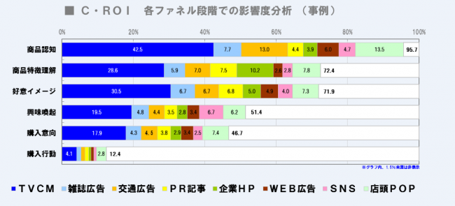 結果、認知効果→テレビCM、商品理解効果→企業HP、興味喚起効果→SNS、購買→店頭POPといった各KPIにおいて強い分野の傾向を把握することができます。