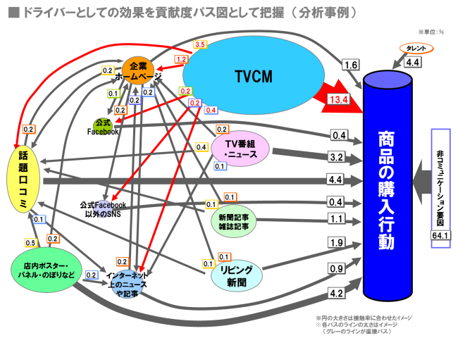 「企業のホームページから購買につながった」場合に、そのホームページを見る「きっかけになったのはテレビCM」であったりします。そういったパスやその太さを明確にしていきます。
