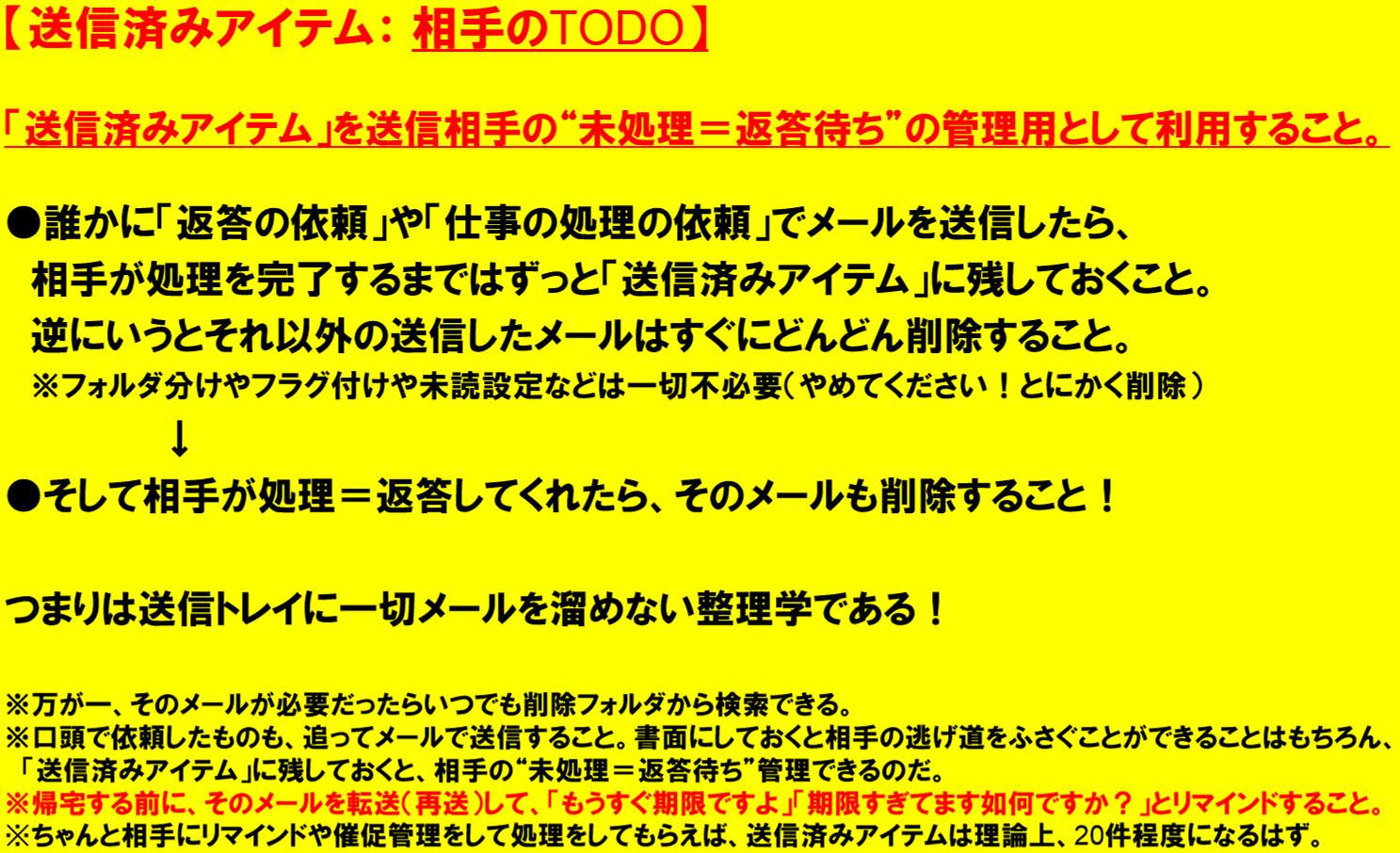 管理方法としては、帰宅する前に期限が迫っているメールを転送(再送)して、「もうすぐ期限ですよ」、「進捗はいかがですか?」とリマインドする。ちゃんと相手にリマインドや催促管理をして処理すれば、送信済みアイテムも理論上、20件程度になるはずだ。つまりは送信済みアイテムに一切メールを溜めない整理学である!