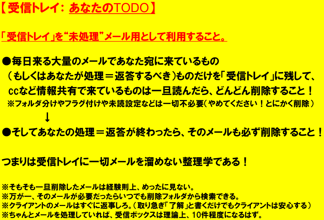 そして、処理が終われば、メールに返答すると同時にそのメールを削除するのだ。これで、残りのタスクを受信トレイのメール数として可視化することがきる。また、CCなど情報共有で来ているものは一旦読んだら、どんどん削除すること!