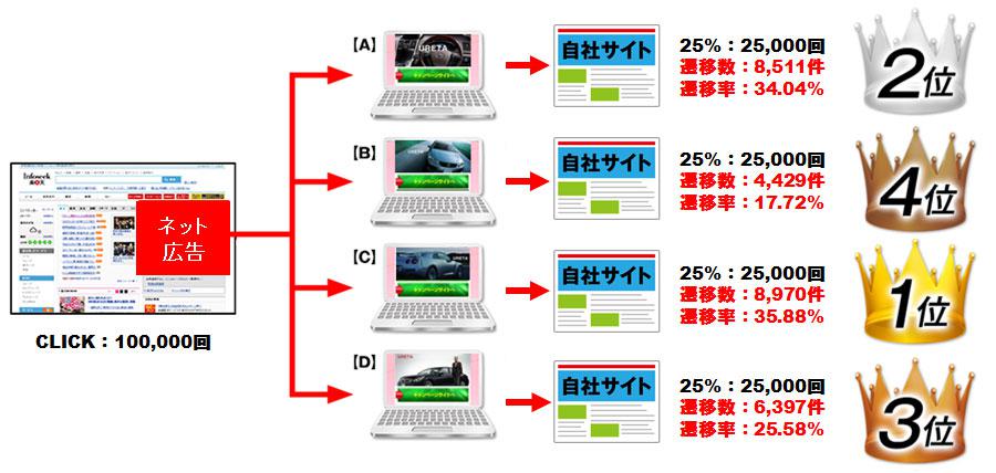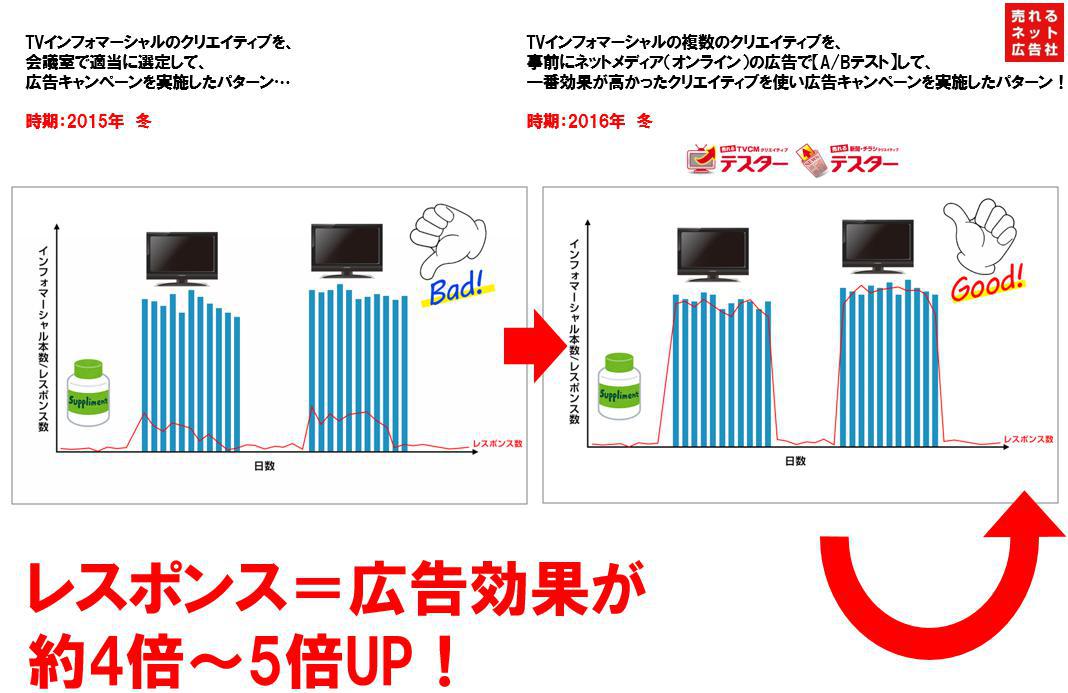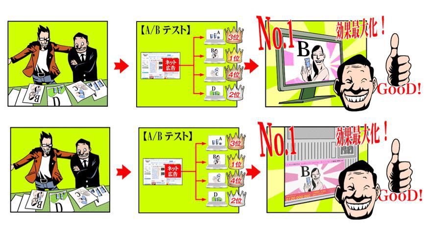 ただし、ネットメディア上の【A/Bテスト】で一番効果が高い広告クリエイティブは、マスメディア(オフライン)でそのまま使っても同様に一番効果が高い!だからこそ、ネットメディア(オンライン)広告を使って、つまりは“ネット広告”を使って、TVCMや新聞広告などの広告クリエイティブの【A/Bテスト】を行うことが重要である。