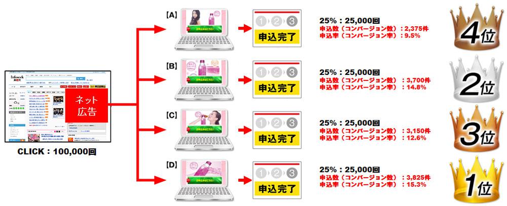 まずは、当たり前だが、通販などレスポンスを目的とする会社はシンプルに、各クリエイティブが載っている「広告クリエイティブテスト用ランディングページ」からの “申込率(コンバージョン率)”を見れば、どのクリエイティブが1番高い効果となるのかがわかる!